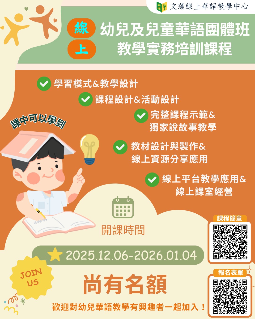 【線上華語教學中心】超熱門課程-文藻幼兒及兒童線上華語團體班教學實務師資培訓 熱情招生中!