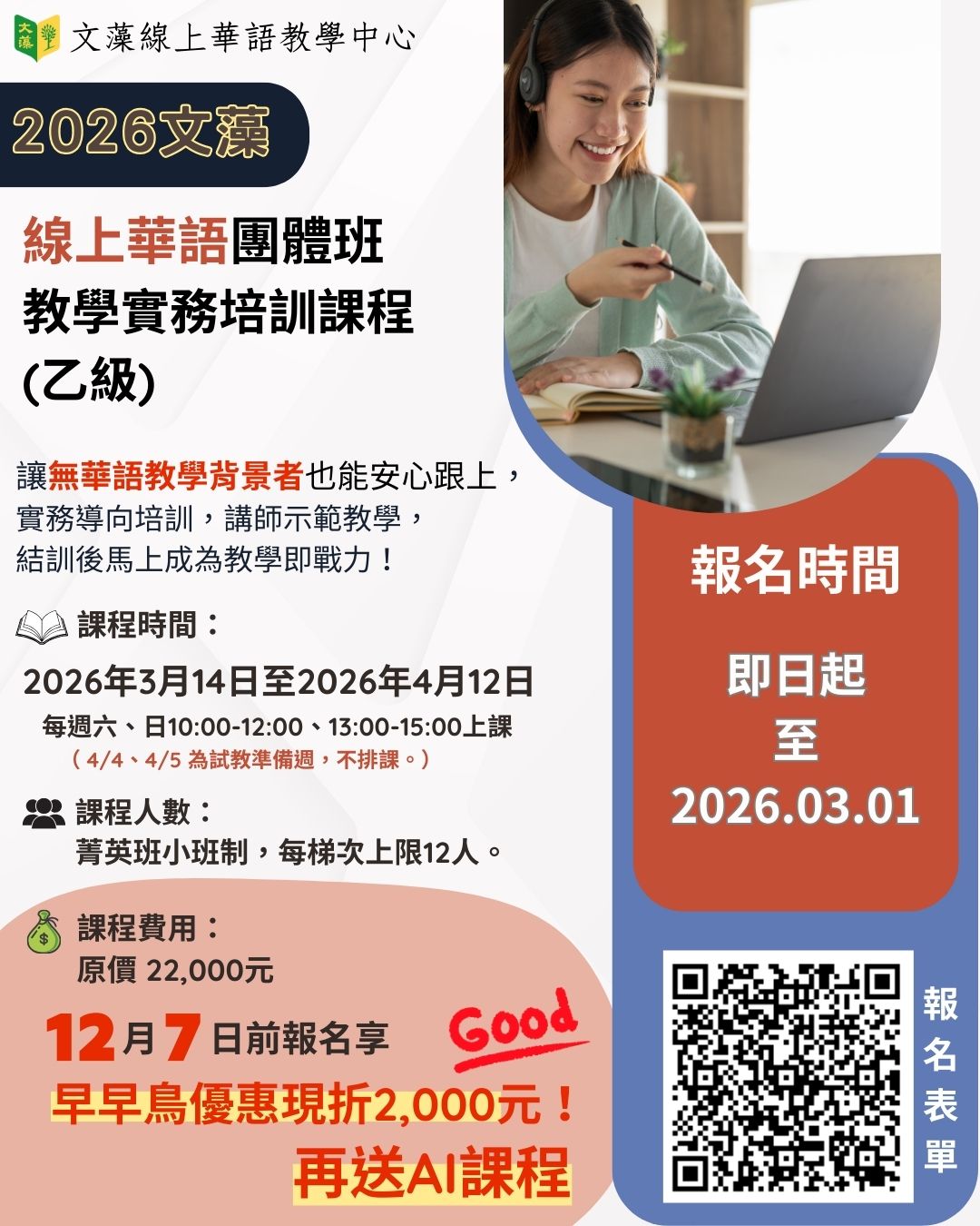 2026文藻線上華語團體班教學實務培訓課程〔乙級〕正式開放 ! 報名享優惠