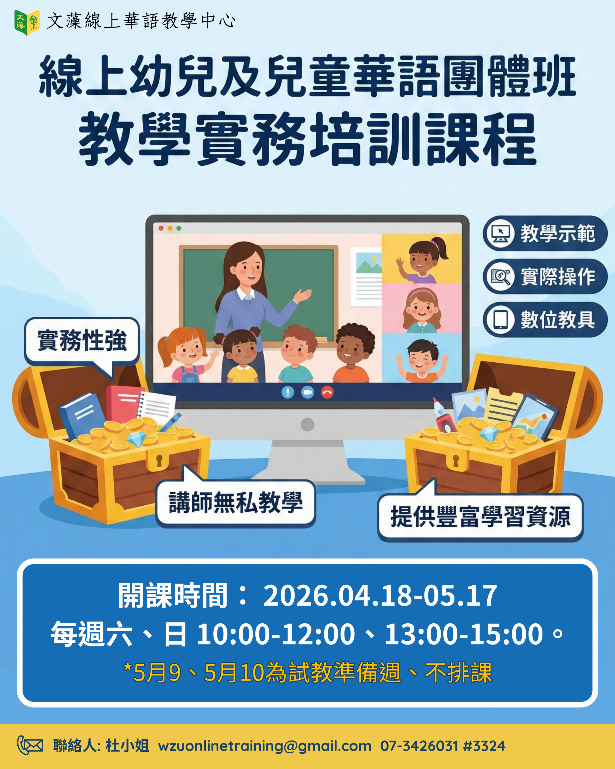 文藻幼兒及兒童線上華語團體班教學實務師資培訓課程|開放報名中|2月22前報名只要18,000元、2月13日前報名再加送「一對一教練課」